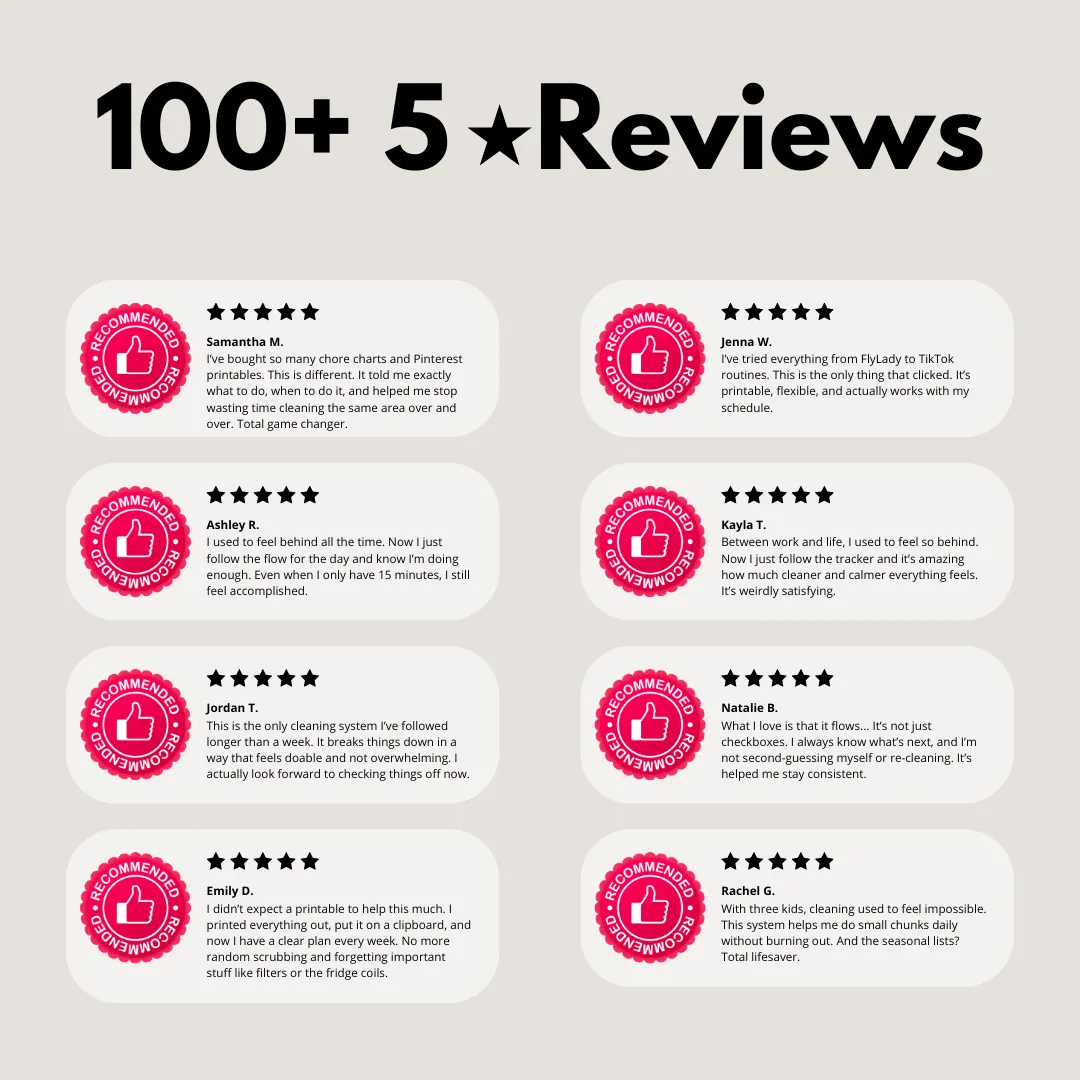 "I’ve bought every chore chart and cleaning schedule out there. This is the only one that didn’t make me feel worse for falling behind. It’s flexible, realistic, and somehow made me want to clean again. I’ve been using it for three months and my home has never looked better."
